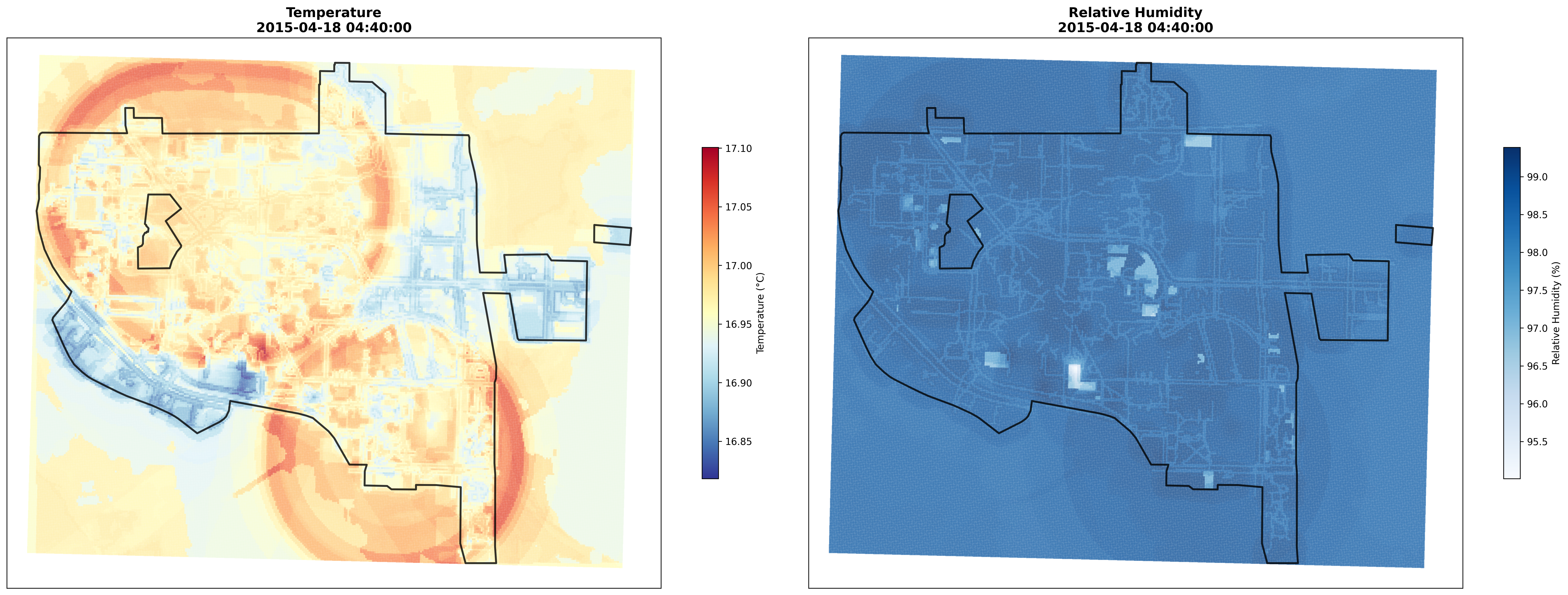 This project combines multiple advanced techniques to predict microclimate weather patterns at Georgia Tech campus with high spatial and temporal resolution. The pipeline integrates FusionLSTM (a TFT-inspired architecture featuring multi-scale LSTM branches with attention) for time series prediction with Regression Kriging to generate campus-wide maps. The model predicts Temperature and Relative Humidity at 100,283 grid points using multi-variate time series and geospatial features.