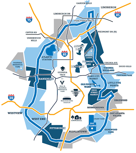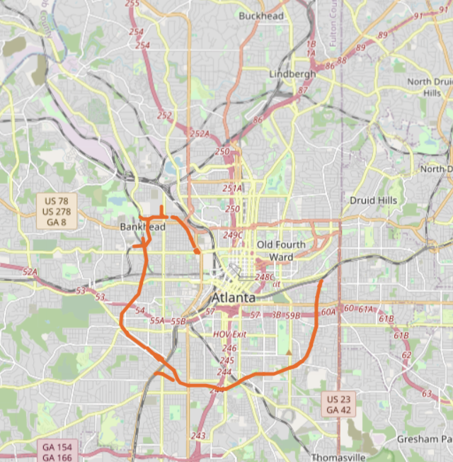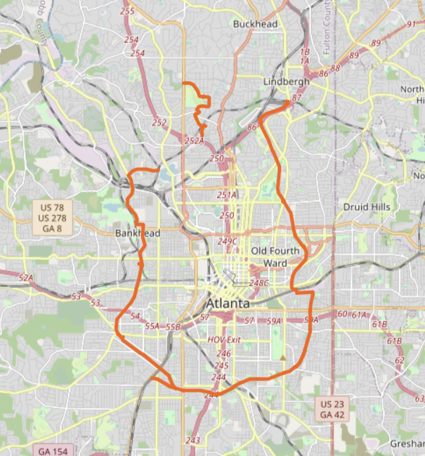 We automate the process of labelling certain regions as 'within the Atlanta Beltline's catchment zone' by using commuting paths from OpenStreetMap that correspond to the Atlanta Beltline - namely, a bike trail and a railway. To experiment with a different beltline, such as a beltline that spanned across Atlanta horizontally, or simply expanded north by x miles, we would acquire the OpenStreetMap ID's of existing paths (bike trails, walking paths, roads, etc.) corresponding to our desired Beltline, and paste these into config.py. Alternatively, we can create a such path ourselves in OpenStreetMap. Then, any region containing segments of these trails would automatically receive a "Beltline Score" which boosts its perceived attractiveness by agents.