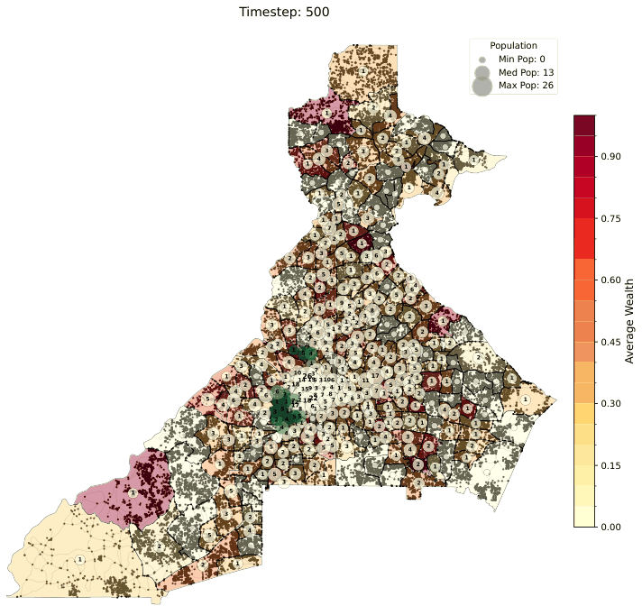Our code outputs a GIF to visualize agent behavior over time. Each circle represents the centroid of a census tract - green signifying those in the Atlanta Beltline - and the encircled number is the agent population. Our code also outputs a CSV file containing all the simulated data at every individual timestep.